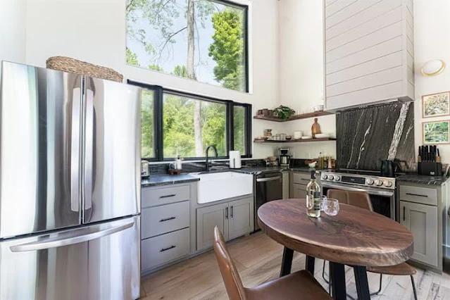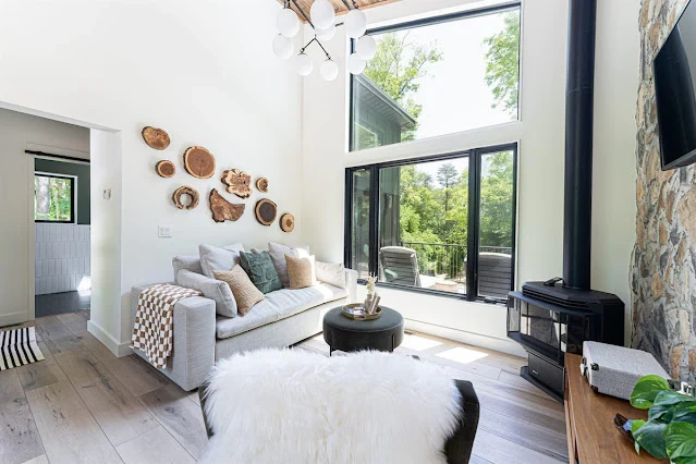 À l’intérieur de la cabane, le salon est lumineux et spacieux, grâce à l’abondante lumière naturelle qui pénètre par les grandes fenêtres. Le point central de la pièce est une agréable cheminée à gaz, qui crée une atmosphère chaleureuse et accueillante. La salle de séjour est en continuité avec la cuisine bien équipée.