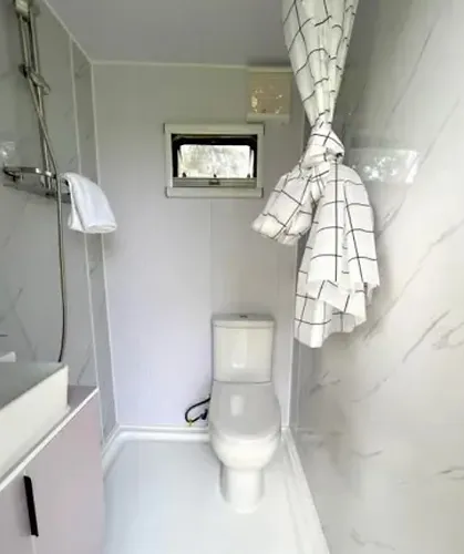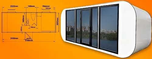 Murs et toiture isolés ; huisseries en aluminium avec double vitrage à contrôle solaire ; verrouillable à l’aide d’une clé et d’un cylindre à bouton ; fenêtre à guillotine ; dimensions de transport 5950x2300x2550 mm (LxlxH) ; lever les yeux ; cadre en dessous ; équipé de trous de cuillère et de pieds réglables ; inutilisé Intérieur : sanitaire avec douche ; toilette; lavabo avec mitigeur et meubles bas et miroir ; Ventilateur; Prises murales 220 volts avec connexion USB ; Plafonnier à LED ; 3 pièces de fenêtres à guillotine avec protection solaire et moustiquaire ; rideau; coffre de lit avec espace de rangement et table de chevet ; disjoncteur différentiel, placard, espace de rangement ; (à l’exclusion des accessoires) Externe : Point de connexion 220 volts ; point de raccordement à l’eau chaude et froide ; raccordement à l’égout ; Matériaux externes : Panneau composite en aluminium ; Feuille d’aluminium monocouche de fluorocarbone blanc ; double couche légère haute résistance à la compression Matériaux internes ; Plaque de bouton plate en bois-plastique ; plaque écologique de qualité HE ; inutilisé