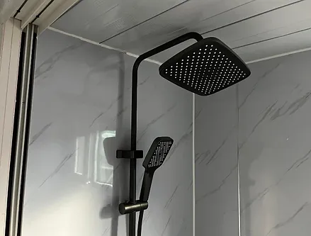 Maison/chalet de luxe dépliable et équipé ; taille 40 pieds / 12 mètres ; équipé de murs et d’un toit isolés ; salon/espace de vie ; 3 chambres/chambres séparées (verrouillables avec clé), cuisine avec comptoir en marbre, mitigeur + évier, armoires de cuisine et tiroirs ; local sanitaire avec WC ; Douche à effet pluie ultra luxueuse avec commande tactile, lavabo avec armoire de toilette. Plancher de vinyle aspect bois ; cadres en aluminium avec fenêtres en verre miroir ; Prises de 230 volts ; interrupteurs d’éclairage, points de raccordement pour l’éclairage au plafond (plafonniers) ; dimensions de transport, une fois plié : [LxlxH] 1200x225x258 cm ; inutilisé